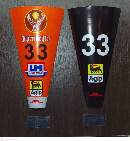 Base de madera oscura de 200x200mm con decoración de las trompas de los autos de escudería Eurobrun utilizados por Oscar Larrauri en 1989.