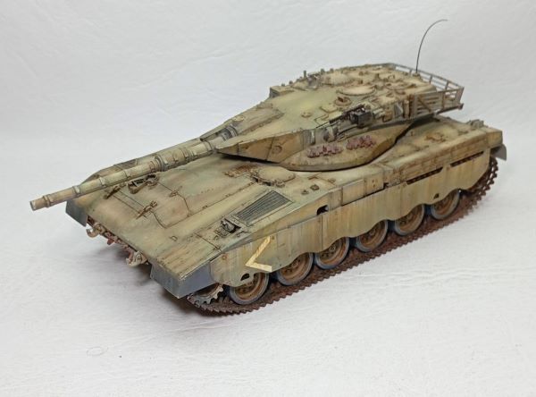 Israel decidió fabricar su propio tanque luego de una negativa de Inglaterra de suministrarle tanques Chieftain, ( quien protegía sus intereses en países árabes), desarrolló entonces el tanque Merkava, buscando también una respuesta a los T 62 soviéticos que tenían las naciones árabes. Aquí la versión I con el esquema que se utilizó en la invasión al Líbano en 1982, el tanque continúa al dia de hoy en versiones modernizadas. la maqueta de Tamiya reproduce fielmente la ingeniería de esta máquina de guerra. Contaba con un cañon de 105 mm.